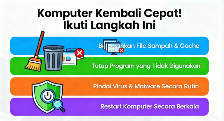 Kunci utama agar komputer tetap lancar adalah perawatan rutin dan kebiasaan penggunaan yang bijak. Dengan begitu, komputer Anda akan selalu siap mendukung aktivitas kerja, belajar, dan bisnis tanpa hambatan.